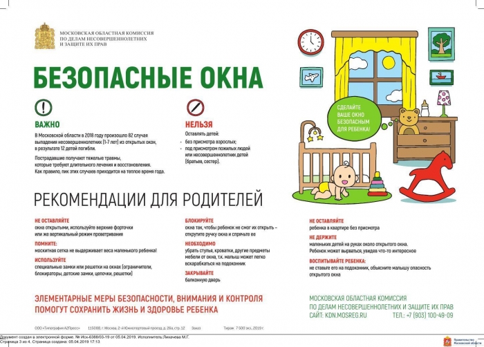 В соответствии с пунктом 2.18 Комплексного плана мероприятий по профилактике безнадзорности, беспризорности, наркомании, токсикомании, алкоголизма, суицидов, правонарушений несовершеннолетних, защите их прав на территории Московской области на 2019 год на территории Сергиево-Посадского городского округа с 08 апреля по 01 июня 2019 года проведена акция «Безопасные окна», направленная на предупреждение выпадения малолетних детей из окон многоквартирных домов.